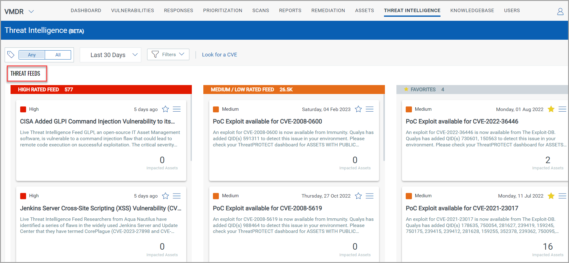 The Threat Feeds widget displays continuous information about exploits, vulnerabilities, and adversaries. The following screenshot shows the Threat Feeds categorized as High, Medium/Low, and Favorites: