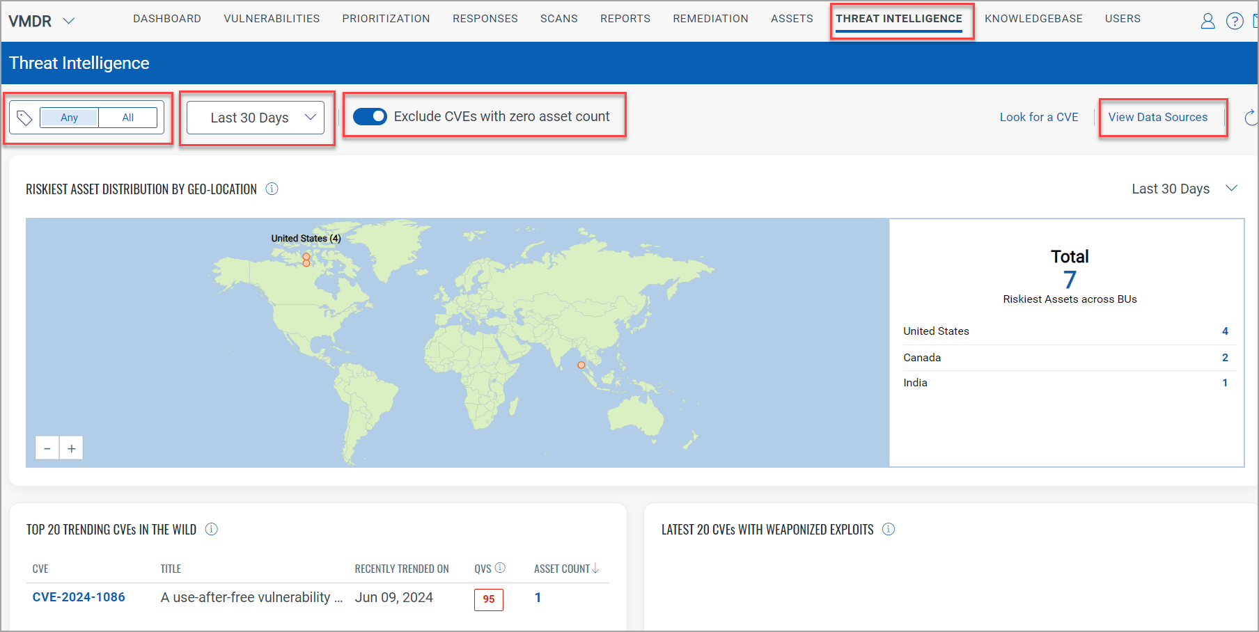 Latest 20 CVEs with Weaponized Exploits The widget displays vulnerabilities with weaponized exploits. Click on the value to access details on CVEs, QVS, and Asset Counts. |