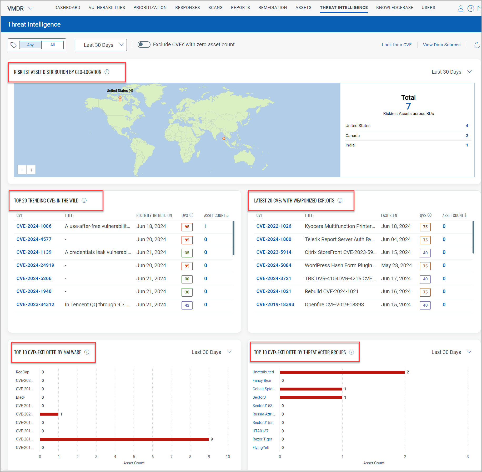 Each Threat Intelligence widget categorizes data by geo-location, trending CVEs, weaponized exploits, exploits by malware, and threat actor groups. The following is the list of Threat Intelligence widgets, along with screenshots that highlight each widget: