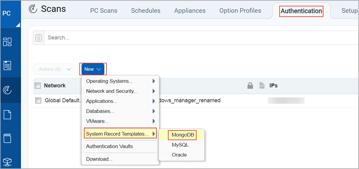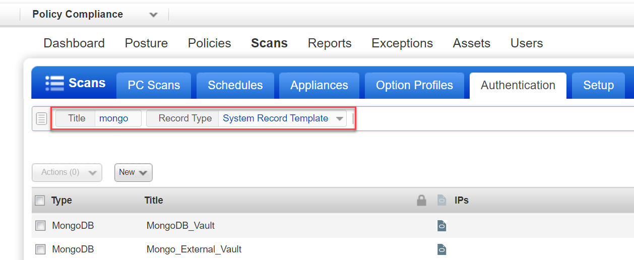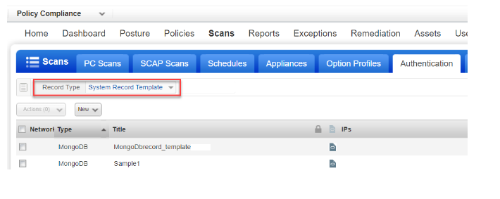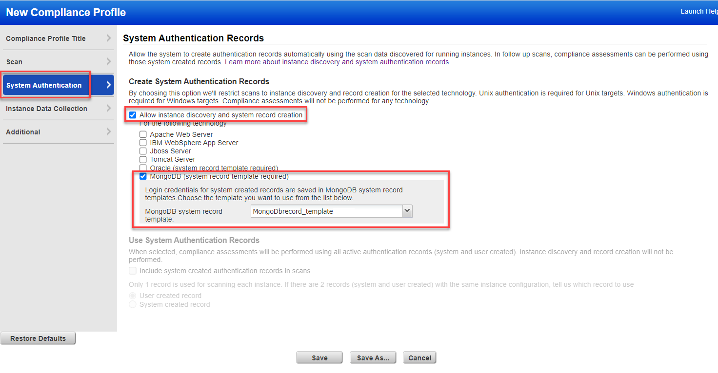 When we auto discover MongoDB instances, we’ll discover the target configuration for each instance but not the login credentials. You'll need to create one or more MongoDB System Record Templates containing the login credentials you want to apply to system created records. You'll select the template in the option profile used for discovery scans. The template will be linked automatically to the system created records created as a result of the discovery scan.
