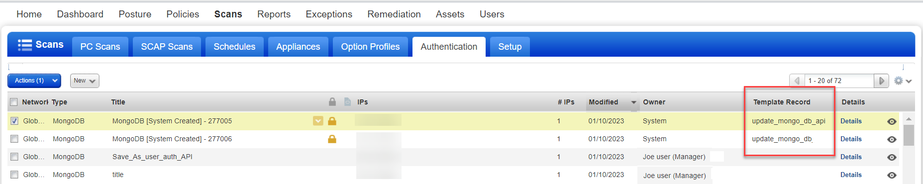 Go to the Scans > Authentication list and you'll see the column Template Record. This column shows the name of the MongoDB system record template associated with each system created MongoDB record in your list.