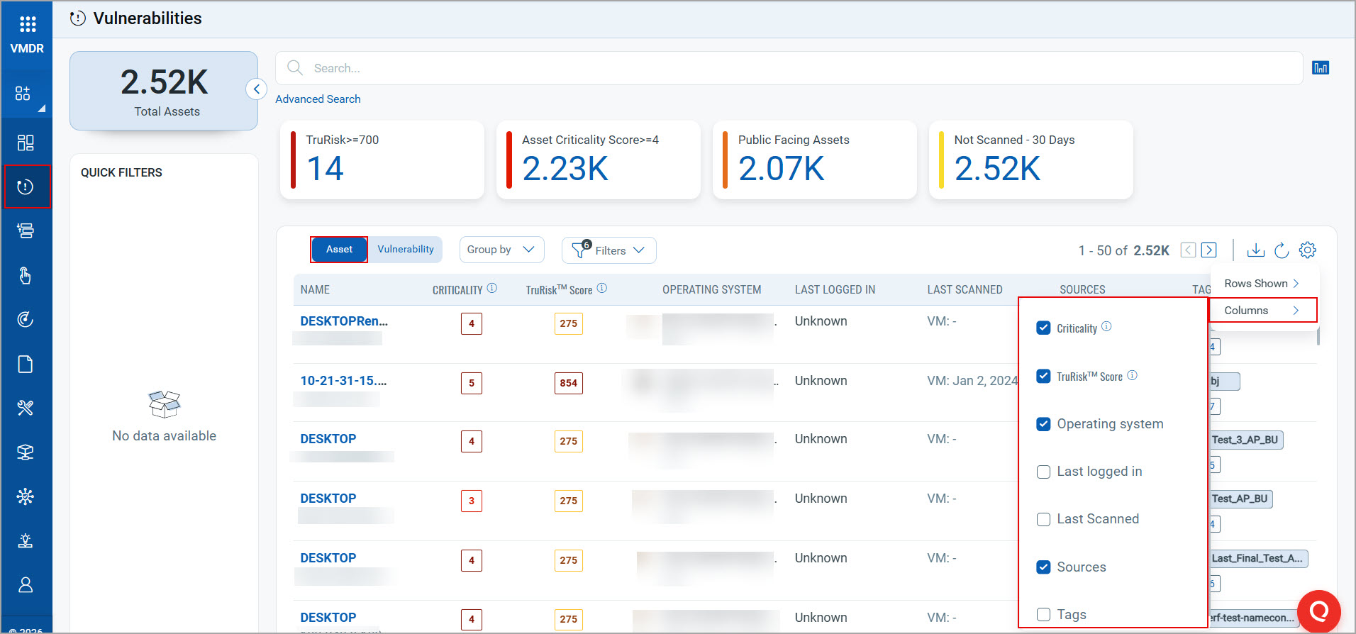 For example, on the Asset tab, to display the Criticality, TruRisk™ Score, Operating System, and Sources columns, click Settings