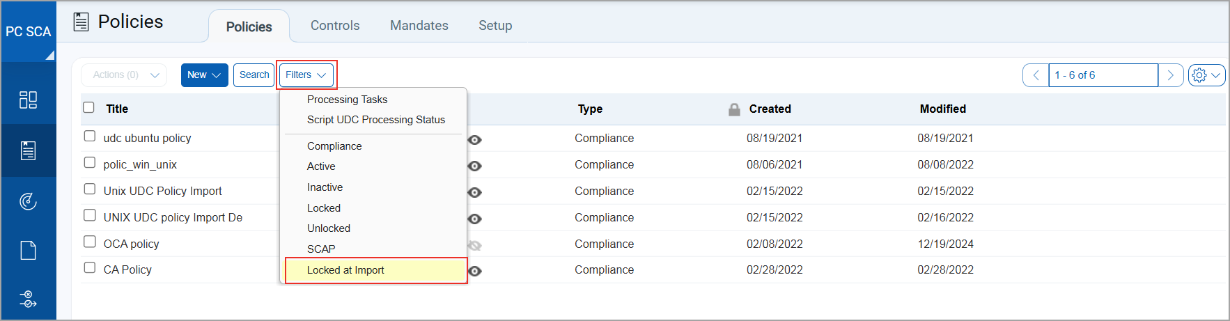 To view only the policies that are locked at import, on the Policies page, click Filters > Locked at Import.