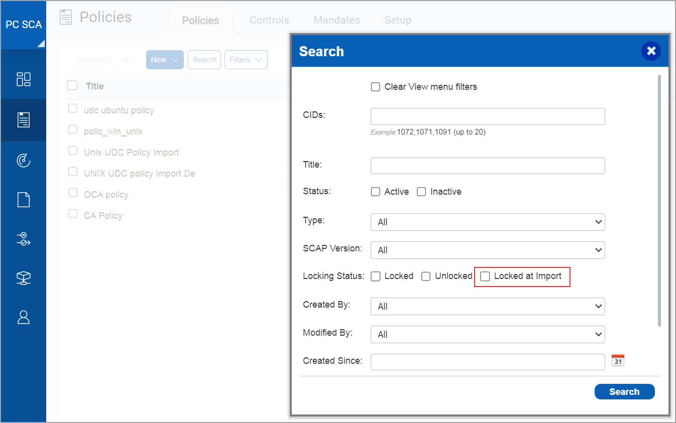 To view only the policies that are locked at import, on the Policies page, click Search > select the Locked at Import checkbox > Search.