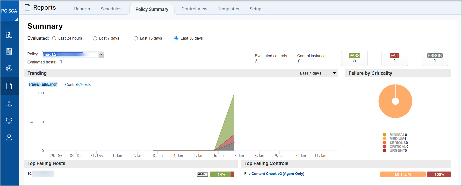 You can quickly run interactive reports from the Policy Summary. Click any control (under Top Failing Controls) to run the Control Pass/Fail report. Show meShow me