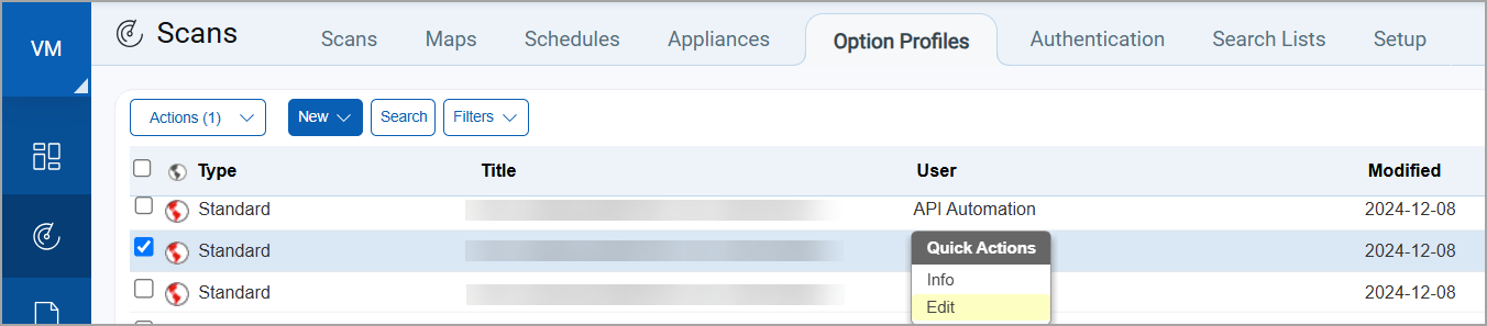 2b - To make changes to an existing option profile, select an option profile in the list and choose Edit from the Quick Actions menu.