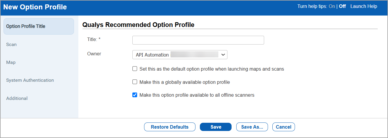 Option Profile Title - This section has basic settings for the option profile like title and owner and whether the profile should be the default profile, or globally available.