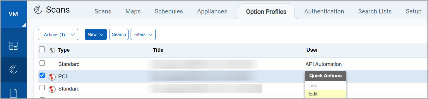 To view all the PCI scan settings, including those that cannot be edited, select Info from the Quick Actions menu for the PCI Option Profile.