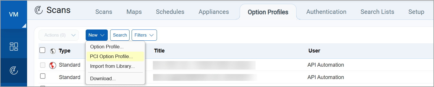 - To create a new PCI option profile, select New > PCI Option Profile.