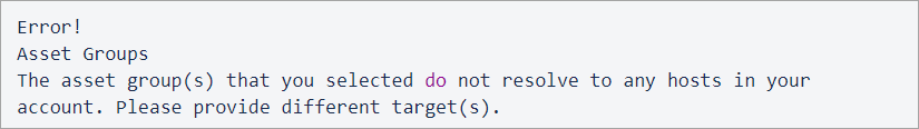 When you schedule a report on an asset group having only NetBIOS or Domain in it, and no IPs added to the asset group or separately while scheduling the report, the report will not get scheduled. Similarly, if it is an on-demand report, the report will not be launched and an error message is displayed. |