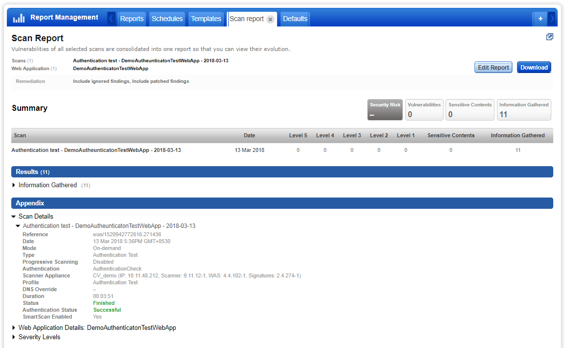 Once the authentication test scan is in Finished state, select View Report from the quick actions menu and view the Authentication Test scan report.