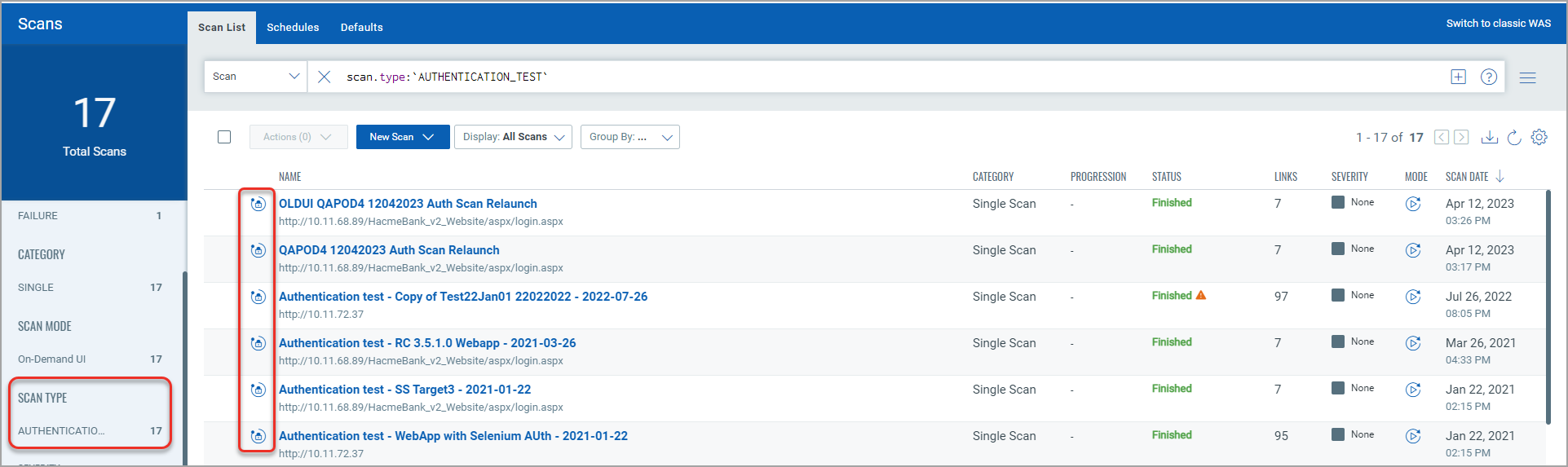 You can use the new filter ‘Authentication Test’ in Type that we added to view only authentication test scans. You could also identify them with the icon associated with the authentication test.