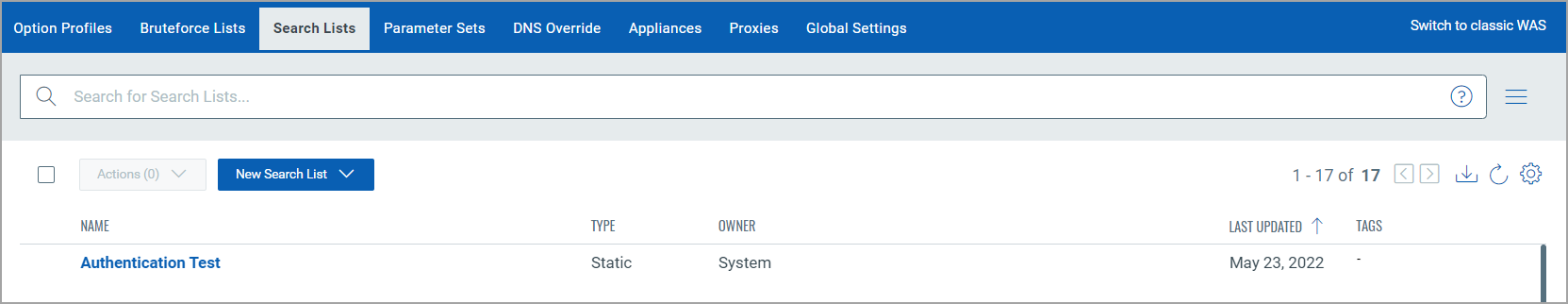 Similarly, for search list, we use system generated (non-editable) search list named as Authentication Test.